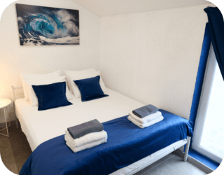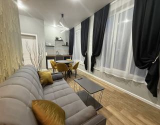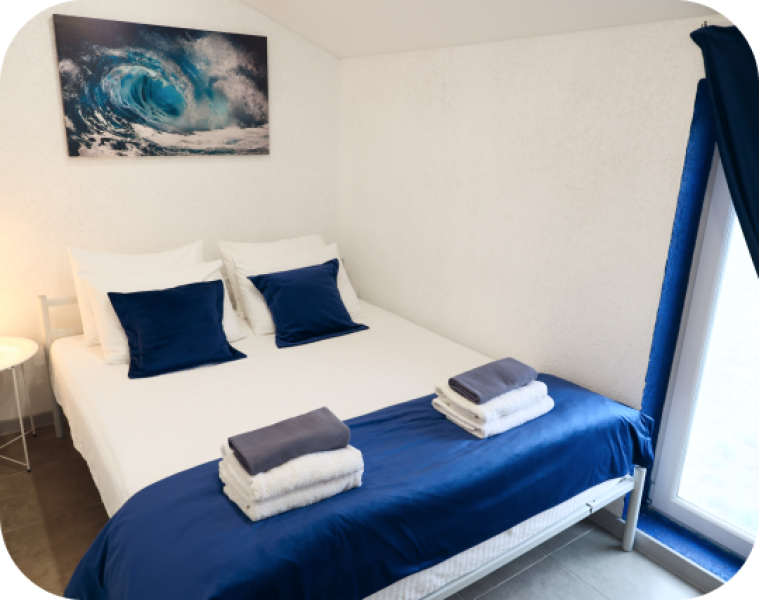 Рядом находится оборудованный песчаный пляж с шезлонгами.