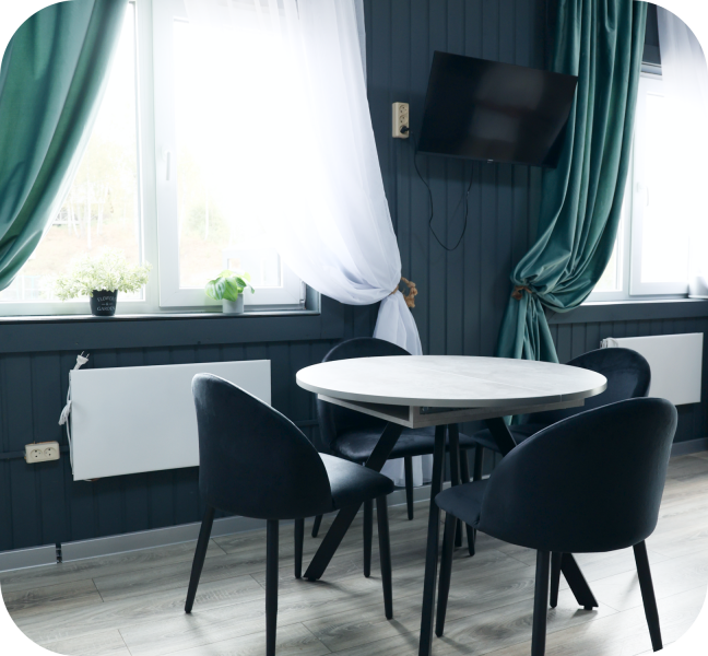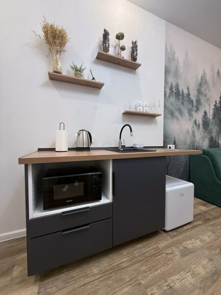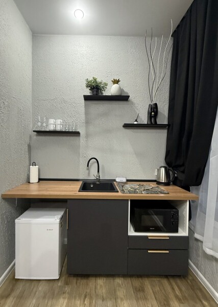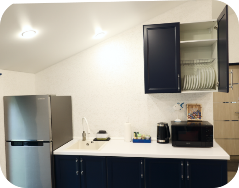 - Оборудование: микроволновая печь, мини-холодильник, набор посуды, плита электрическая, телевизор ЖК, чайный набор посуды, электрочайник