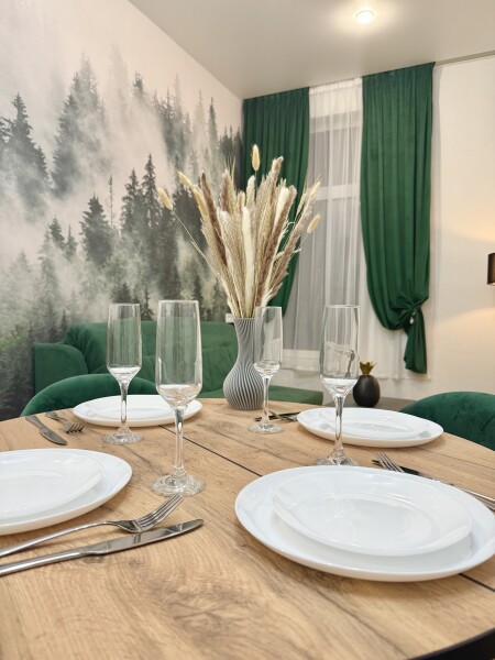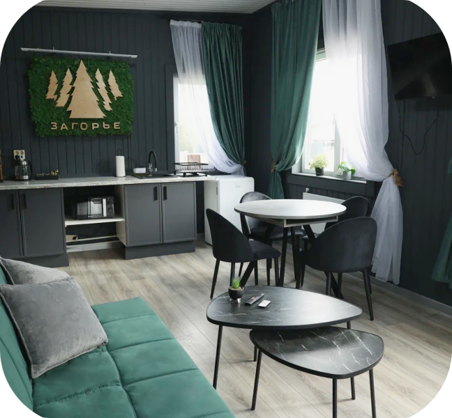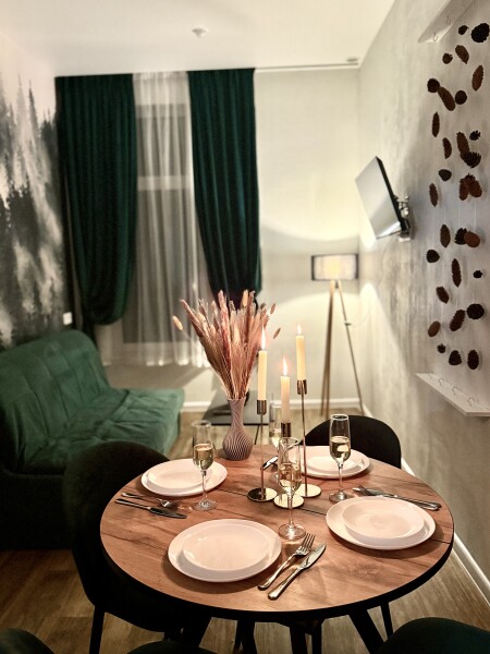 | Апартаменты 2-мест.Туманный лес | 30 кв.м. | 2 чел. | Мебель (диван, зеркало, кровать двуспальная, прикроватные тумбочки, стол, стулья, шкаф), Мини-кухня,... | |