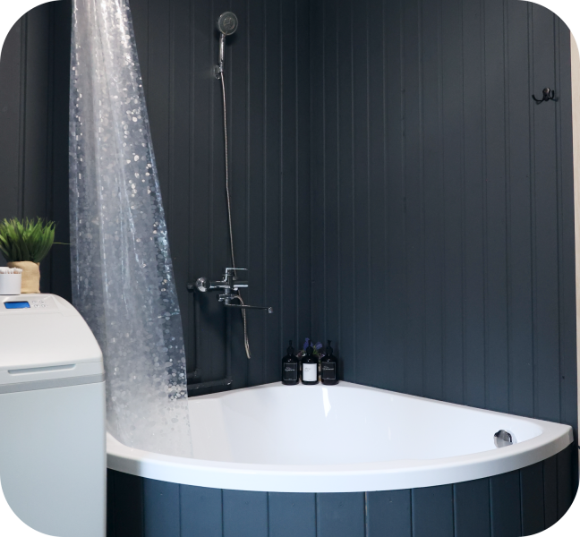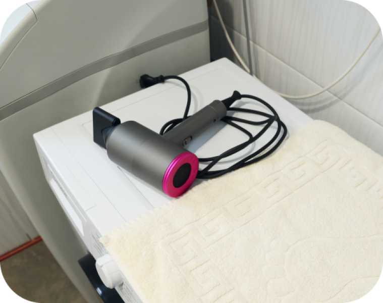 - Оборудование: гладильная доска, кондиционер, микроволновая печь, мини-холодильник, набор посуды, плита электрическая, стиральная машина, сушилка для белья, телевизор ЖК, утюг, чайный набор посуды, электрочайник